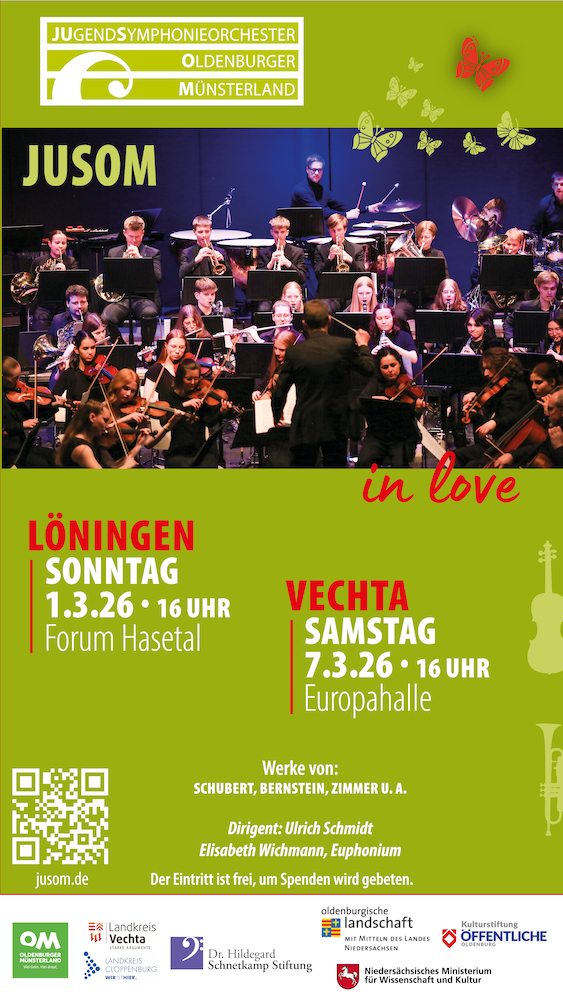 Im Jugendsymphonieorchester Oldenburger Münsterland, kurz JUSOM, sind Schülerinnen und Schülern aus den Landkreisen Cloppenburg und Vechta. In einem Symphonieorchester spielst du mit rund 60 Musikerinnen und Musikern zusammen – es treffen sich Bläser, Streicher und Schlagzeug. Dabei sitzt du mitten in einem großen Klangkörper und lernst interessante Musikstücke kennen.